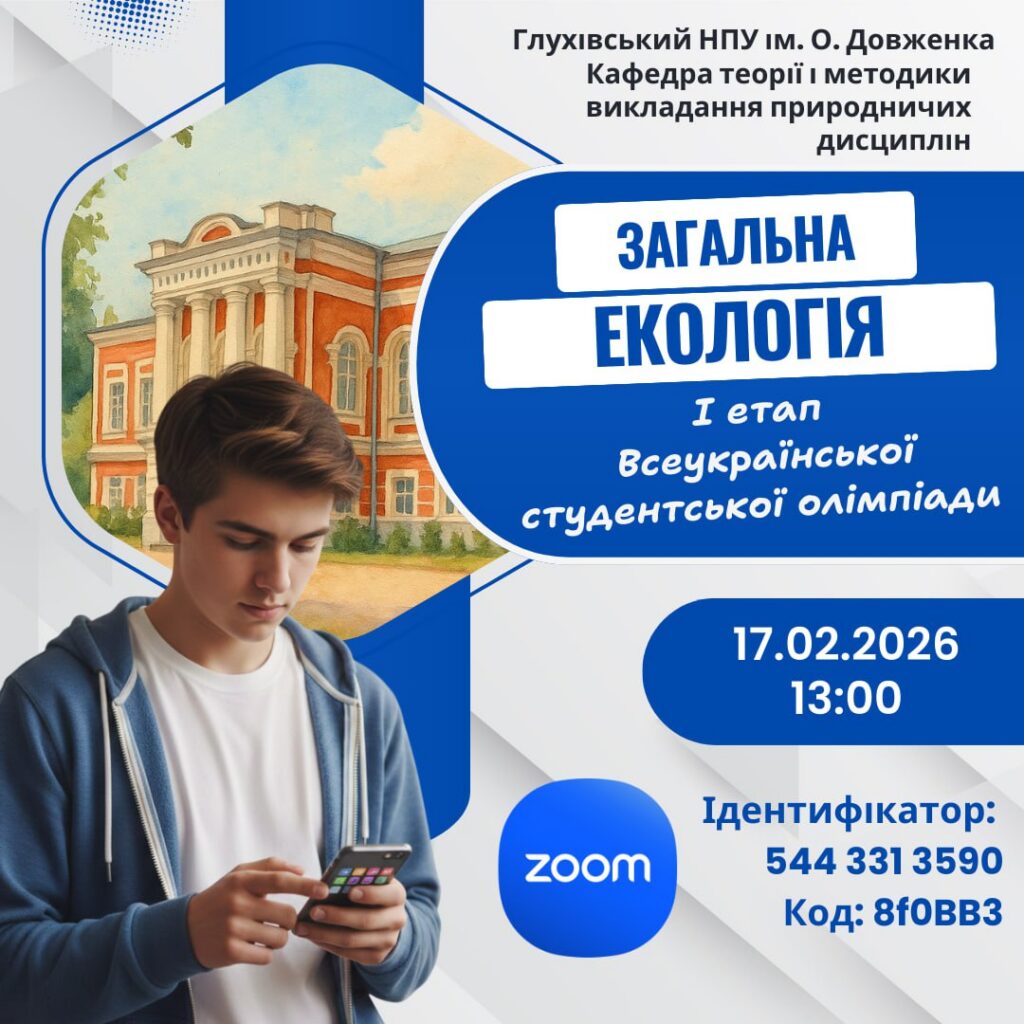 Кафедра теорії і методики викладання природничих дисциплін Глухівського НПУ ім. О. Довженка запрошує здобувачів вищої освіти взяти участь у І етапі Всеукраїнської студентської олімпіади із загальної екології в онлайн форматі