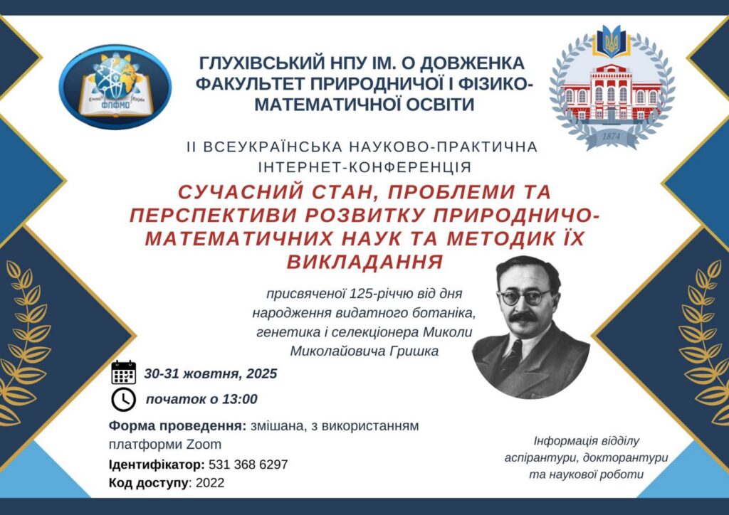 Пленарне засідання ІІ Всеукраїнської науково-практичної інтернет-конференції «Сучасний стан, проблеми та перспективи розвитку природничо-математичних наук та методик їх викладання» відбудеться 30 жовтня 2025 року у дистанційному форматі. Початок о 12:50.